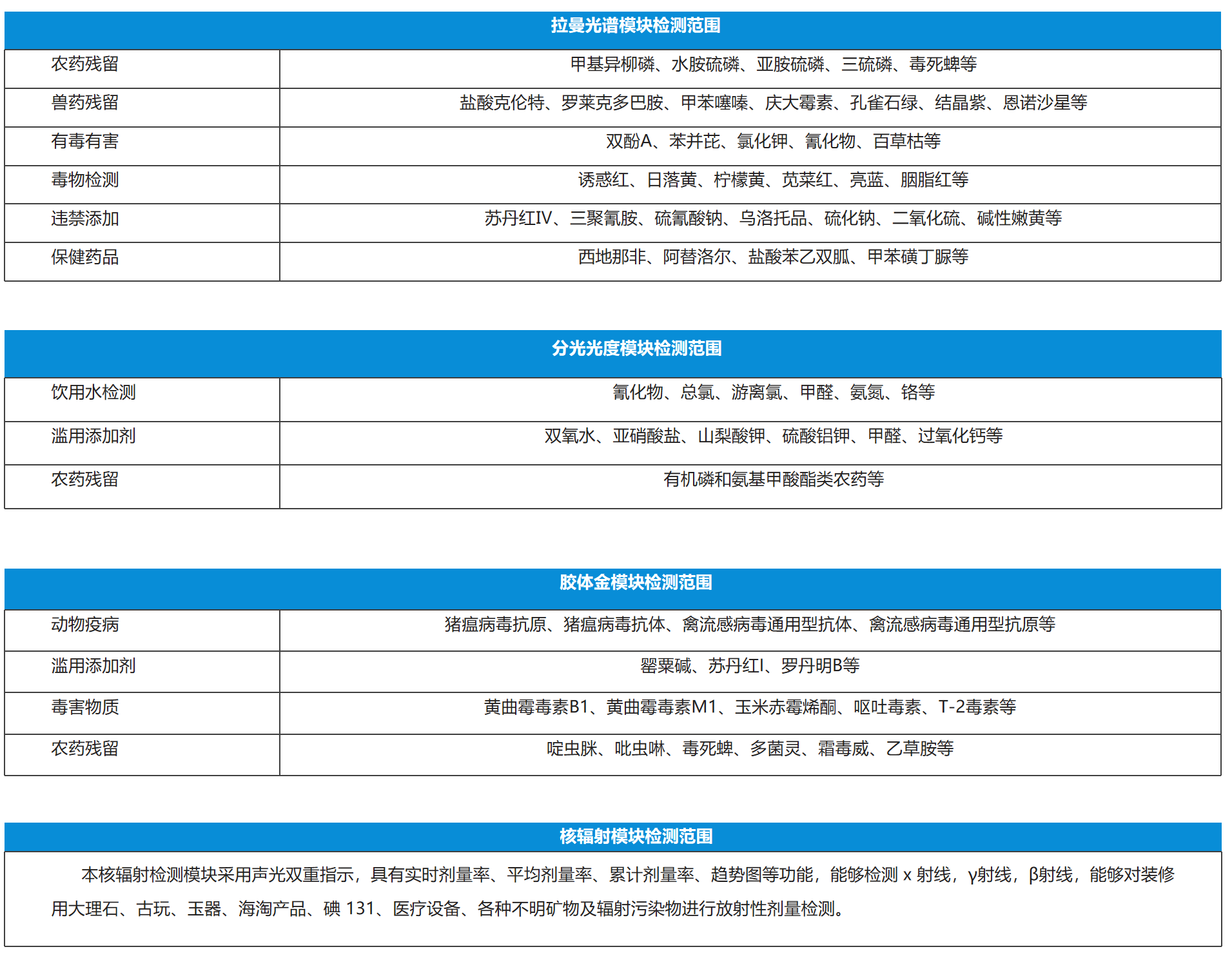 便携式四合一多功能检测仪集表面增强拉曼光谱(SERS)技术、分光光度法、胶体金分析法、核辐射检测方法(选配)于一体,不同检测技术相辅相成,弥补了单一技术检测缺陷,大大提升了检测性能。可现场快速检测食品中的违禁添加、滥用添加、保健药品、农药残留、兽药残留、投毒物质等;还可以检测重金属、水质、土肥、保化、兽药、抗生素、细菌毒素等指标。